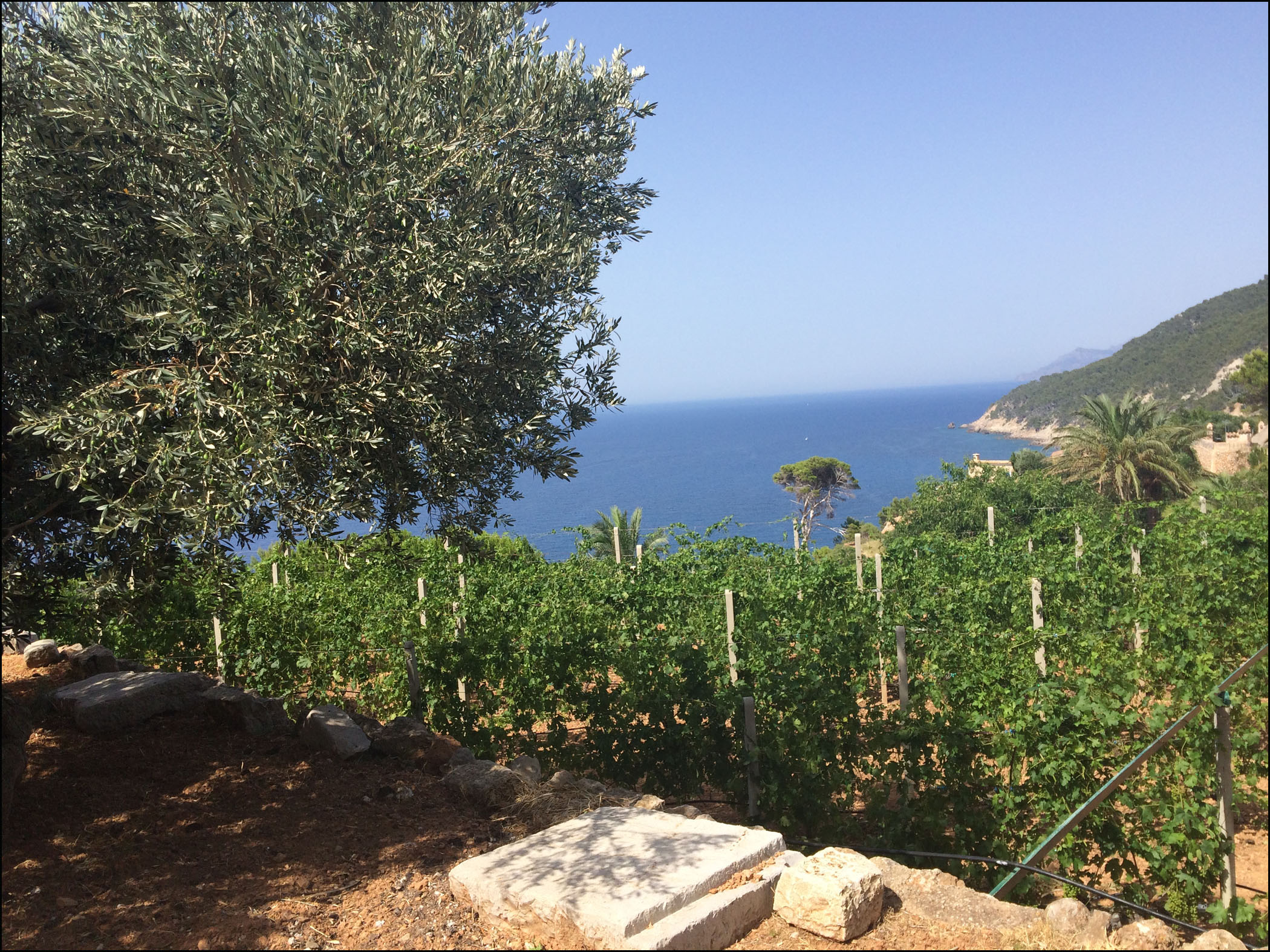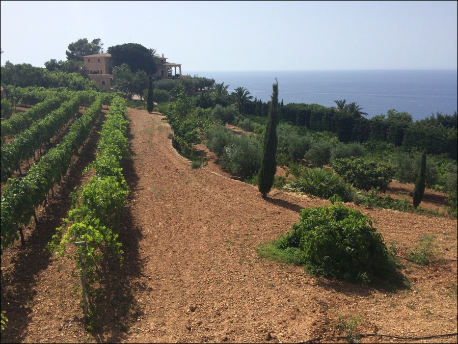 Mariona was just locking the gate when we pulled up at 5:00, and although she had a fair drive home to Palma, she readily agreed to reopen the tasting room for us. We walked together along a broad terrace amidst olive trees, lavender bunches, and amazing views of the terraced coast and azure sea, to a small outside counter-style tasting bar where Mariona poured from inside the shady Bodega. Tasting room ambiance just doesn’t get better than this!