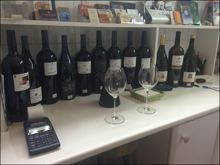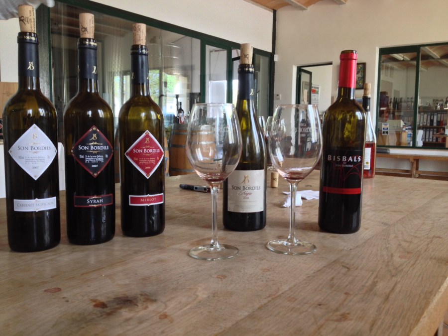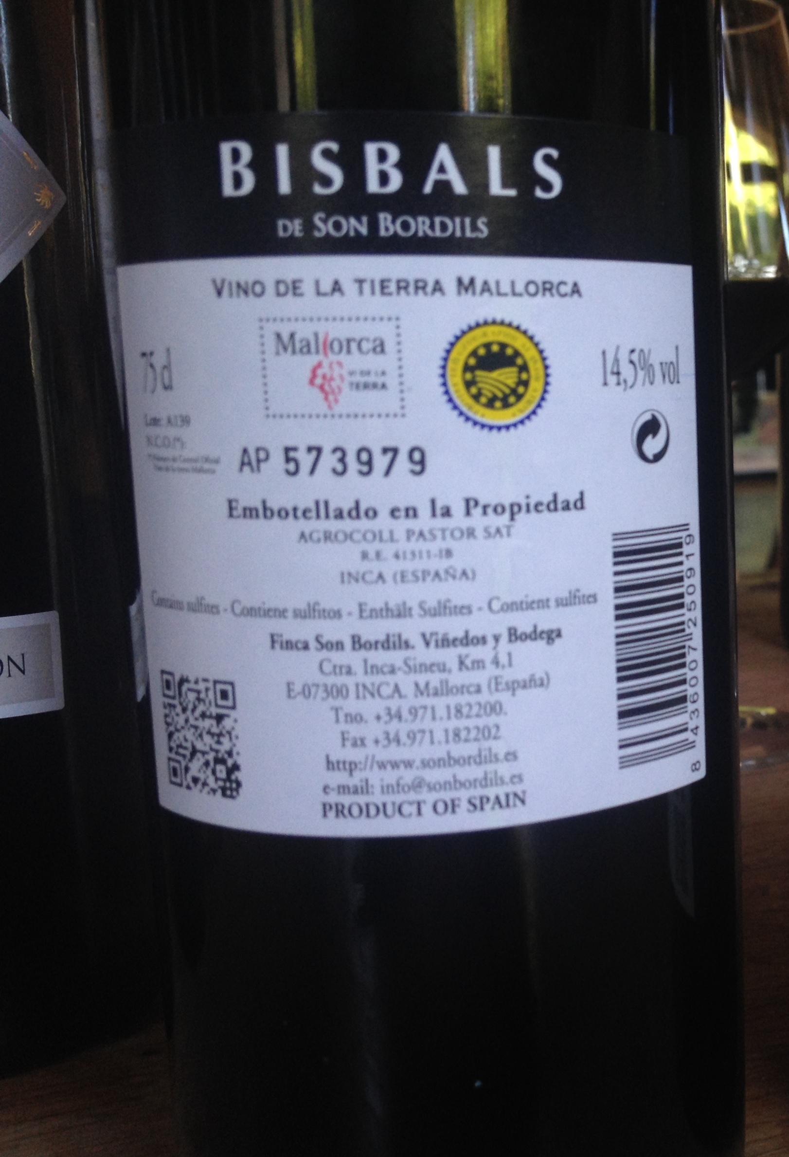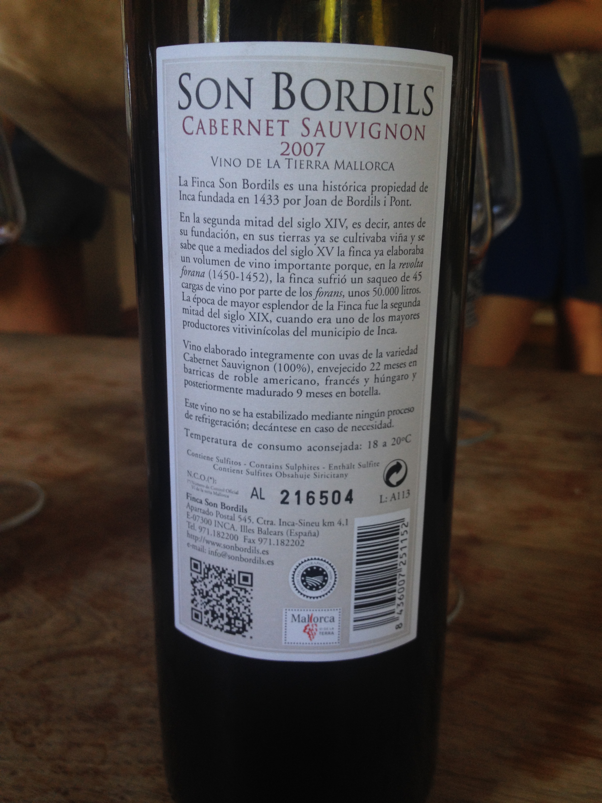 Merie: Our last taste was Gran Vinya Son Caules, made from a hand picked selection of grapes from the oldest vines. It is 90% Callet grape, the rest is usually Manto Negro and Fogoneu, depending on the year. The other varieties help with color, as apparently Callet oxidizes easily. Oxidation changes a wine’s hue and taste…as a wine ages it is oxidizing so winemakers keep track of this as they perfect their product. (Remember the purposefully oxidized wine at Cellar Ca’n Pico?) Maria said this is her father’s favorite. It’s the one he is presenting to show that Callet is a good grape, but standing alone it would perhaps not appeal 100% in color and aroma, and that would hurt sales. She said (and I translate and thus paraphrase) “Blends let you create the wine you want, the look, the scent, and the flavor. 100% of one grape can be no more than what that grape can offer.”