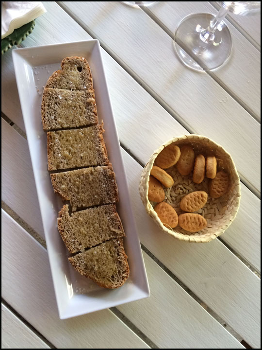On the tasting table were six glasses – one for each wine to taste, and crackers, cheese, and Ribas olive oil. Sylvia started by explaining a little bit about each wine, then poured and left the bottle on the table as we are given time to enjoy the surroundings and talk as she came and went.